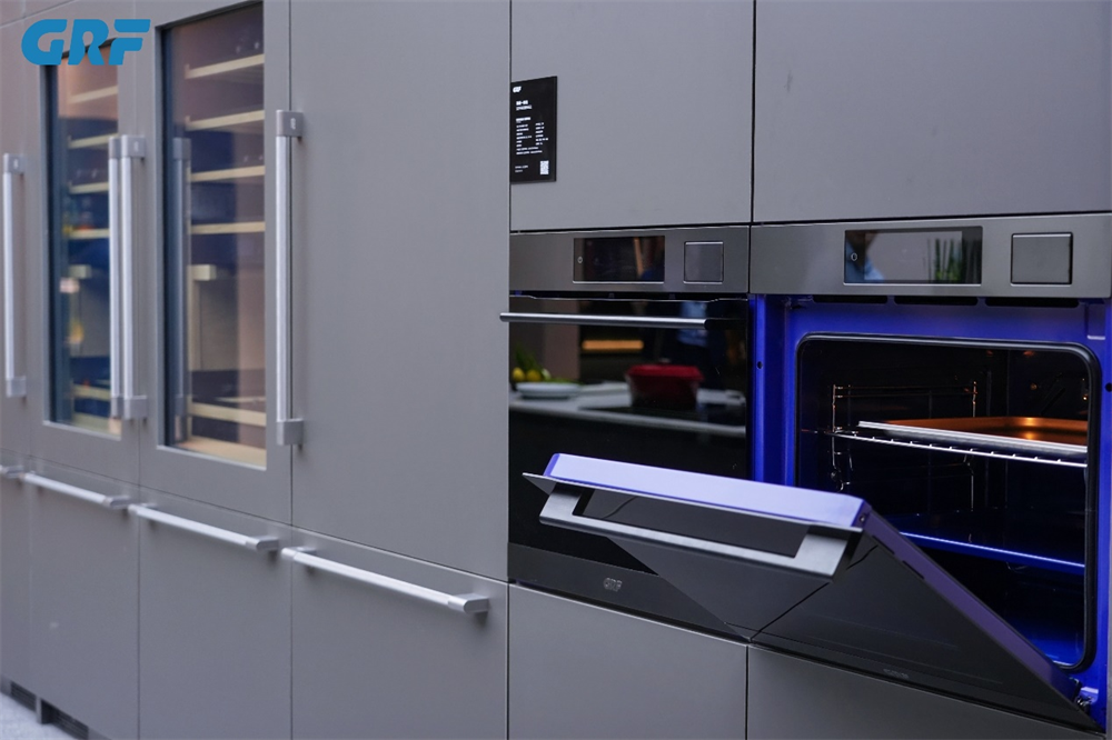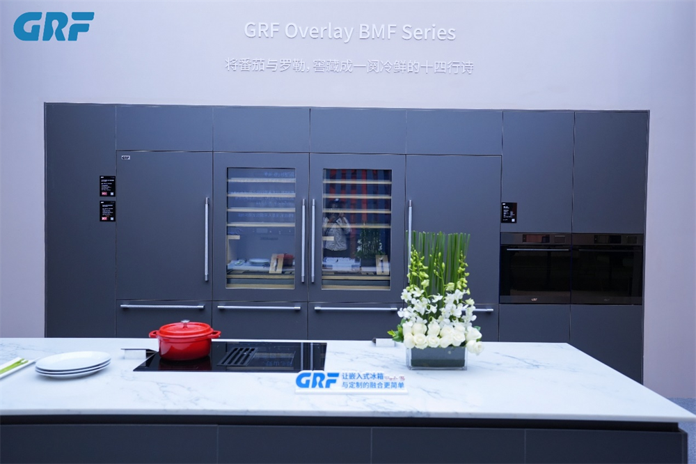 更为重要的是,本次展会上GRF正式以一体化嵌入式厨电品牌的姿态全新亮相。我们不仅展示了嵌入式冰箱与酒柜组成的四连排套系,更首次将嵌入式洗碗机、电磁灶、蒸烤一体机等全系厨电协同呈现。所有产品遵循统一的设计语言与嵌入式标准,共同构建出风格纯粹、整洁协调、功能完备的现代厨房整体解决方案,彻底告别传统厨电的拼凑感,真正实现了厨电与家居环境的有机统一。